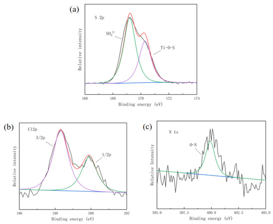 The XPS spectra of SO42−/TiO2, Cl−/TiO2, and NO3−/TiO2, with S 2p (a); Cl 2p (b); and N 1s (c); (element S exists mainly in the form of SO42− and Ti-O-S, element Cl exists in the form of Ti-Cl, and element N is attached to Ti in the form of NO3−).