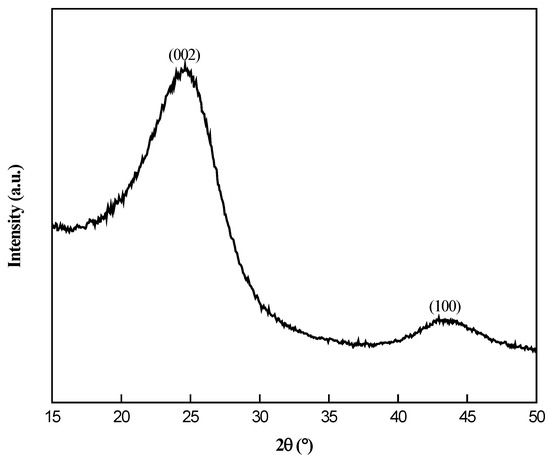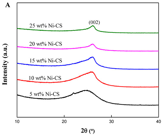 An X-ray diffraction (XRD) analysis was conducted to examine the crystalline structure of the synthesized electrocatalysts, as depicted in Figure 1 and Figure 2. According to Figure 1, the two diffraction peaks at angles of 24.61° and 43.21° are related to the X-ray reflection from the (002) and (100) planes, respectively, which correspond to the graphitic carbon phase [23,24]. The XRD patterns are consistent with the JCPDS card (No-41-1487) of graphite. By comparing Figure 1 and Figure 2A, it can be seen that, after Ni was loaded into candle soot, the peak for (100) planes disappeared. This phenomenon occurred because Ni metal filled up the carbon lattice after metal loading [12]. In Figure 2B, the XRD curve of the Ni–CS catalyst shows several peaks at 2θ of 44.63°, 51.73°, and 76.35°, which correspond to the (111), (200), and (220) planes of cubic Ni crystal (JCPDS No. 47-1049). The intensification of peaks was observed with the augmentation in Ni loading, indicating the presence of a highly crystalline-phase metallic Ni on the CS. However, XRD analysis of the 5 wt% Ni–CS catalyst reveals only one small peak around 43.96°, corresponding to the presence of nickel (Ni) metal. The observed phenomenon can be attributed to the insufficient amount of Ni, which impeded the proper crystallization of metallic Ni. Consequently, the disordered state failed to exhibit any distinct peak in the XRD pattern [25]. Nickel diffraction should be around 44°, due to the broad peak appearing for the metallic nickel in the XRD analysis for 5 wt% at 35–50° which can be attributed to the nanocrystalline nature of the nickel particles. This happens when the crystallite size of a material is small, the XRD peaks become broader due to the limited number of lattice planes that contribute to the diffraction signal, which is known as the Scherrer effect [26,27].