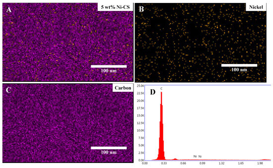 (A) Mapping images, (B) Nickel element, (C) Carbon element, and (D) EDX of 5 wt% Ni–CS catalysts.