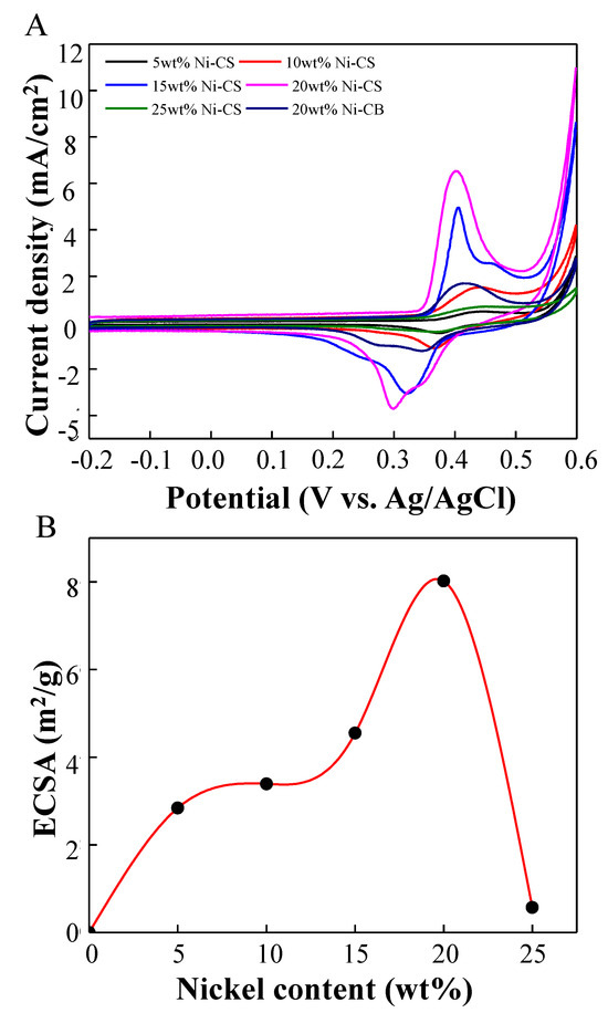 Cyclic voltammograms of 5 wt%, 10 wt%, 15 wt%, 20 wt%, and 25 wt% Ni–CS and 20 wt% Ni–CB catalysts in (A) 1.0 M NaOH at scan rate of 50 mVs−1 and (B) effect of the nickel content on the ECSA value.
