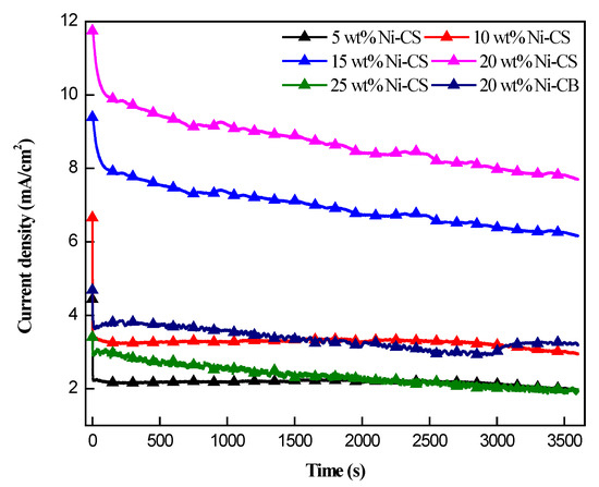 Chronoamperometry of 5 wt%, 10 wt%, 15 wt%, 20 wt%, and 25 wt% Ni–CS, and 20wt% Ni–CB catalysts in 1.0 M NaOH + 1.0 M CH3CH2OH at potential of 0.5 V.