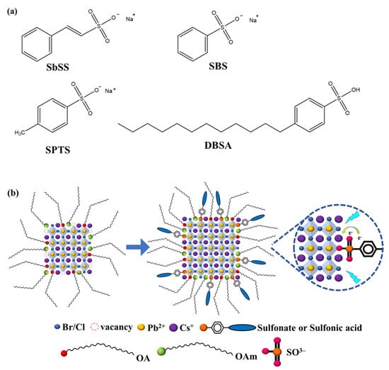 - Kuan, C.-H.; Yang, S.-H. Surface ligand engineering of perovskite nanocrystals with a conjugated sulfonate ligand for light-emitting applications. Mater. Adv. 2022, 3, 7824–7832. [Google Scholar] [CrossRef]