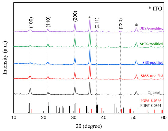 - Zhang, M.; Hu, W.; Shang, Y.; Zhou, W.; Zhang, W.; Yang, S. Surface Passivation of Perovskite Film by Sodium Toluenesulfonate for Highly Efficient Solar Cells. Sol. RRL 2020, 4, 2000113. [Google Scholar] [CrossRef]