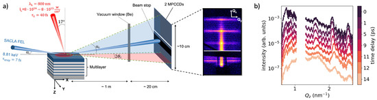 Schematics of the experimental setup to investigate the surface and subsurface solid-density plasma dynamics with GISAXS using single femtosecond X-ray FEL pulses. (a) An ML sample consists of 5 repetitions of tantalum (Ta) and copper nitride (Cu3N) of 4.5 and thickness covered by a aluminium capping layer. The samples were irradiated by an optical laser with a central wavelength of , intensity of or with pulse duration. The laser is irradiated by an incident angle of from the surface normal in p polarization. The X-ray pulses with photon energy, FWHM duration are irradiated on the sample at the grazing-incidence angle of , i.e., slightly above the critical angle of external total reflection of the layer materials. The laser beam is defocused to obtain a ∼500 m spot diameter to cover the X-ray footprint of ∼300 m at the surface. Scattered photons are recorded by 2 modules of the MPCCD area detector placed around the specular direction. The strong specular peak at is blocked. (b) In-plane signal along (at ) for different time delays between 0 and after the laser intensity peak.