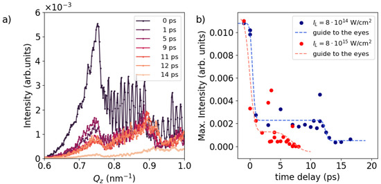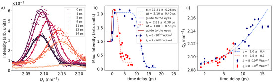 resulting in values for and a width of . Here, A represents a stretching factor, denotes the time at which the error function decreased to half of its initial value, is the duration of the decrease, and B stands for a constant offset. In comparison, the same analysis for the higher-laser-intensity case of 8 × 1015 W/cm2, is depicted with red circular dots. Similar to the lower-intensity case, the ultrafast increase in scattering intensity within the first ∼1 ps is evident. However, for the time delays ≥1 ps the amplitude quickly begins to decline again. The refined error function yields a time constant of and a width of . On top of the change in the Bragg intensity, we observe a steady increase in the Q-position with time delay for both laser intensities, as summarized in Figure 2c. This shift towards larger Q-values implies compression of the double-layer structure as the typical length scale decreases. Assuming that