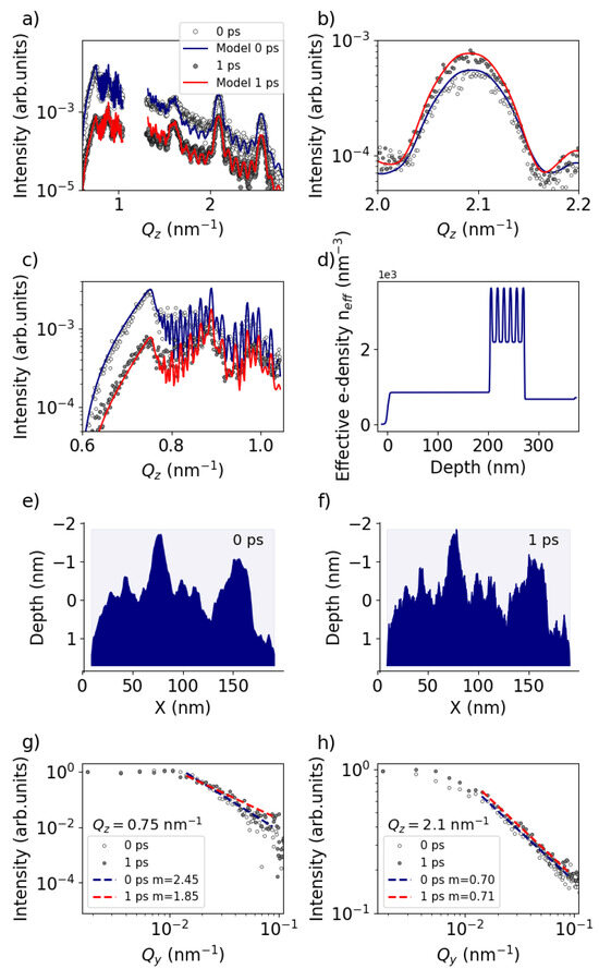 To facilitate a more quantitative discussion of the ultrafast surface dynamics, we employed the BornAgain [18] GISAXS analysis program (v 1.19) to model our experimental observations. The white circular dots in Figure 4a represent the experimental data at while the grey dots depict the signal at a delay of . The solid lines represent the BornAgain model corresponding to the effective electron density profiles shown in Figure 4d. Figure 4b,c provide enlarged views of the intense peak at and the surface-sensitive Yoneda region, respectively. According to the model, the observed variation between the blue () and red () lines in Figure 4a–c can be attributed to the decrease in the Hurst parameter of the Al surface layer from to , indicating an increase in the spatial frequency of roughness, as illustrated schematically in Figure 4e,f. This observation is supported by analyzing the out-of-plane signal along at different positions. Figure 4g illustrates a lineout along at the Al Yoneda peak. The decay starting at is modeled via