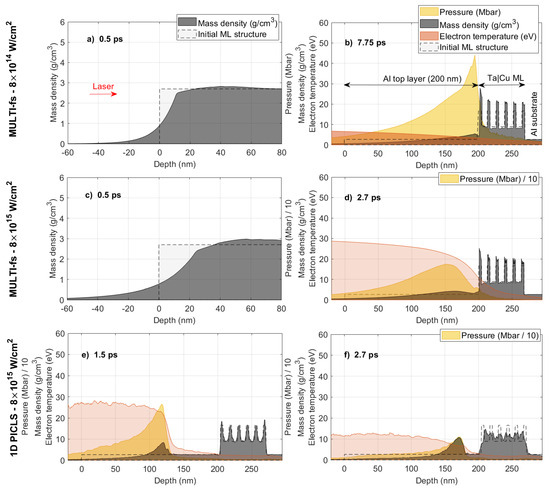 MULTI-fs hydrodynamic simulations irradiated by a p-polarized laser pulse with a duration of 50 fs, a wavelength of 800 nm, and a laser intensity of (a,b) and (c,d) , respectively. Time delays are (a,c) 0.5 ps, (b) 7.75 ps and (d) 2.7 ps, respectively. The ML structure is the same as the experiment. (e,f) 1D Particle-in-cell PICLS simulation results at time delays of (e) 1.5 and (f) 2.7 ps, respectively. In all figures, the yellow, grey, and red regions represent the laser-induced pressure wave (in Mbar or Mbar), mass density (in ), and electron temperature (in eV), respectively. The dashed line denotes the initial sample density. The red arrow in (a) indicates the direction of the incoming laser.