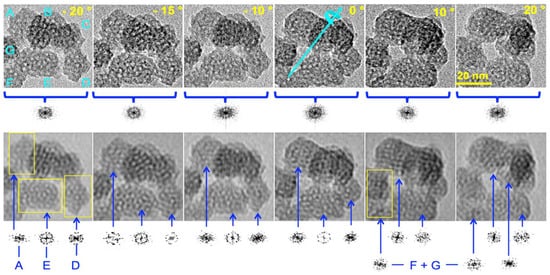 To obtain deeper insights into the intimate ordering of the particles and to address the question of preferential orientation or unusual symmetry, HR-TEM images of particles were taken at different incident angles by tilting the sample under the beam from −20 to +20° (Figure 4). At first sight, there was no obvious apparition of parallel channels while most of the particles looked roughly alike, consistent with no preferential orientation. Another advantage of tilting was the change in the contrast between pore walls and pore voids. This was clearly seen on particles A, D, and E. By contrast, particles B and C, as well as F and G, were superimposed onto one another, generating a moiré pattern that prevented any simple interpretation in terms of structure. The white spots in particles A, D, and E, corresponding to pores aligned with the direction of observation, appeared with different levels of contrast. Their diameters also appeared smaller than the diameter measured from the N2 adsorption–desorption curves (1 to 2 nm instead of 3.9 nm, vide infra). The channel diameter appeared to be smaller than it should, which is usually attributed to channel curvature in the bulky MCM41 [33,34]. Indeed, short-range curvature characterized on large ovoid MCM-41 nanoparticles (>50 nm) could be the rationale for this, although it was inconsistent with the presence of facets and an intense XRD peak [12]. A radial array of channels generated in the presence of TEA molecules was also discarded for the same reasons [16,22,23]. This suggests that the pores were connected to one another through restricted apertures.