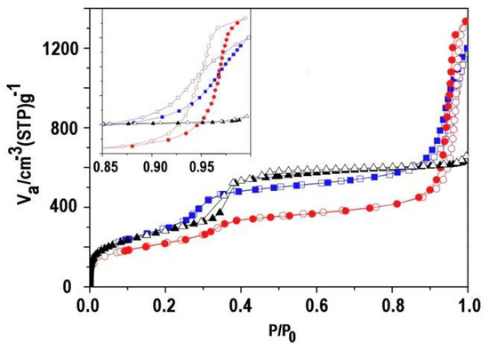 N2 adsorption–desorption isotherms of MSN-23-A (red round mark), MSN-100-B (blue square mark), and bulk classical MCM-41 (black triangle mark). Insert: enlarged part from 0.85 to 1.0 P/P0; adsorption (full symbol); and desorption (empty symbol).