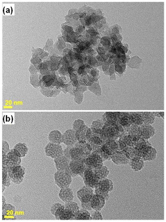 Synthesis of MSN-23-A: The molar ratio of the synthesis solution was 1 SiO2:0.5 NaOH:0.12 CTAB:5.2 10−5 F127:130 H2O. CTAB (Fisher, Bourgoin, France) (0.2 g or 5.5 10−4 mol) and F127 (0.003 g or 2.4 10−7 mol) were dissolved in a solution of NaOH (1 M or 2.3 g) and distilled H2O (8.78 g). After a short time (40 s), TEOS (Alfa Aesar, Haverhill, MA, USA) (1 mL) was added. Dilution by 4, 6, or 8 times was then performed by adding 50, 75, or 100 mL of distilled vwater, respectively. Four minutes later, the pH was adjusted to ca. 5.5 using about 1.1 mL of 2 M HCl solution. Finally, 3 h later, NaOH was added to increase the pH up to ca. 7. The stirring was stopped after 1 h. The suspension was then kept at RT statically and was found to be stable for more than half a year. A solid was obtained by centrifugation, washing, and re-dispersing in distilled water under ultrasonic treatment three times. Surfactants were removed by calcination under air flow while the temperature was increased from 25 to 550 °C for 6 h and then kept at 550 °C for another 6 h. Elemental analysis. MSN-23-A (wt %): C—47.15; N—2.89; H—9.30; and residual mass at 1000 °C—63.