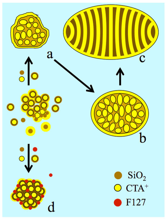 Nanoparticle morphologies produced from silica–micelle hybrids, including silica-coated micelles according to the F127 free route ((a–c): ref. [12]) and in the presence of F127, including the aggregation, ordering, and stabilization of the silica-coated packing (d). CTA+ is shown in yellow, the circles for spherical micelles or strips for surfactant double layers around the micelles and F127 are shown in red, and light and dark brown colors represent the silicate oligomer precursors and polymerized silica, respectively. (a) Ill-ordered strawberry-like particle, (b) intermediate state of nanoparticles, implying the elongation of micelles and pre-ordering, (c) ovoid particles (~50, see Figure S4a), and (d) US-MSN produced from a 3D array of nano-hollow spheres in the presence of F127.