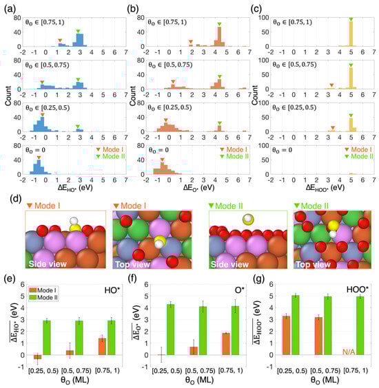 More interestingly, has a non-trivial effect, different for each adsorbate, on the average adsorption energy associated with each mode (Figure 2e–g). For both HO* (Figure 2e) and O* (Figure 2f), as increases, the average adsorption energy associated with Mode I shifts significantly towards weaker adsorption, while that associated with Mode II remains largely unaffected by surface oxygen coverage. The substantial shift in the average adsorption energy associated with Mode I for both HO* and O* suggests that adjacent chemisorbed oxygen atoms weaken their adsorption at pristine sites. This phenomenon has been previously reported for single metals [,]. In contrast, the average adsorption energy associated with Mode II for all intermediates remains mostly constant irrespective of , indicating that adsorption at oxidized sites is minimally affected by other nearby chemisorbed oxygens. For HOO*, the average adsorption energy associated with both modes remains consistent across different ranges (Figure 2g). However, unlike for HO* and O*, increasing significantly impacts the frequency of spontaneous HOO* dissociation. Our simulations reveal that on pristine HEA surfaces, the O-O bond in HOO* dissociates in 95% of the cases during geometry optimization. This frequency drops to approximately 50% when increases to the range and further declines to around 14% when is higher than 0.5 ML. This phenomenon underscores the strong tendency of HEA surfaces to oxidize [].