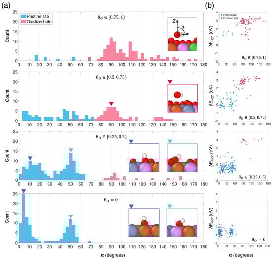 (a) Distribution of the tilt angle, , of HO* with respect to the HEA surface for different oxygen coverages and for HO* adsorbed to pristine (blue) or oxidized (red) sites. The inset in the top plot illustrates the definition of . Insets in the other plots show examples of the configuration of HO* corresponding to some notable peaks in the distributions, indicated by arrows. (b) Correlation between and for different oxygen coverages, with HO* adsorbed to pristine (blue) or oxidized (red) sites.
