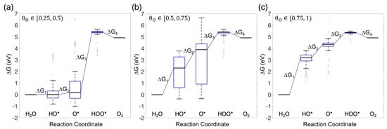 Figure 4 contains the free energy diagrams of the OER on HEAs for the three surface oxygen coverage ranges studied here. The analysis excludes pristine HEA surfaces as HOO* was found to dissociate in most cases on those surfaces. In Figure 4, we employ box plots to visually capture the spread of adsorption free energies for each intermediate, a representation unnecessary for conventional catalysts.