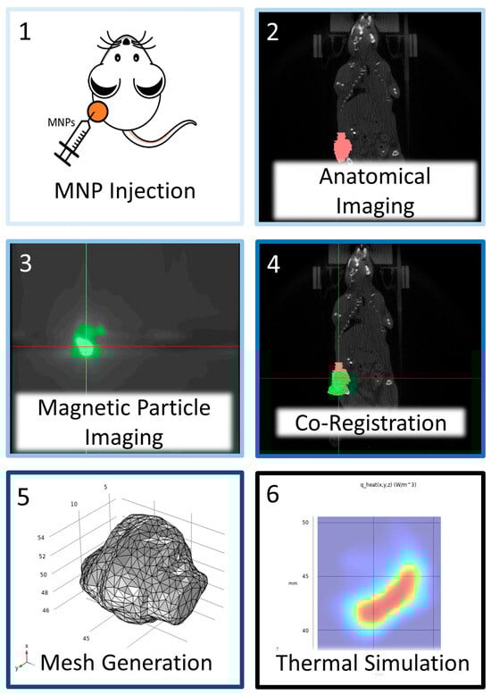 The technology exists to implement MPI-guided MPH; however, we must be able to incorporate MPI data into predictive thermal simulations to accurately estimate the intratumor temperature. Finite element (FEM) and finite difference methods (FDM) applications are available for other hyperthermia modalities. In those cases, the software enables the user to estimate the thermal dose within specified volumes to create thermal dose contours of the tumor and margins [,]. Treatment planning applications for hyperthermia include HyperPlan [,,], SEMCAD X [,], and Plan2Heat [,]. In some cases, commercial finite element analysis (FEA) applications have been validated for hyperthermia []. We have previously validated COMSOL Multiphysics® for preclinical MPH []. Lacking in those previous efforts was a direct knowledge of the MNP distribution in tissue or a tissue-mimicking phantom []. MNP distribution in tumors and surrounding tissue is subject to considerable individual variability, irrespective of the method used to deliver MNPs []. This fact is understudied and often underappreciated, yet it can be a singular source of uncertainty and unreliability in predictive computations of tissue temperature with MPH. It thus becomes essential to develop robust methods to ascertain the MNP tissue content and distribution in each tumor after delivery. Previous work demonstrated integrating MPI data into heat transfer simulations; however, approaches and experimental verification were limited [,]. Here, we describe the results of an effort to develop and verify a clinically translatable thermal simulation workflow that uses 3D MPI data as input for finite element computations to predict tumor temperature during a simulated MPH (Figure 1). To process the MPI and micro CT data, we used an imaging-data processing suite that has clinical utility. Verification was achieved by comparing temperatures measured from tumors in mouse cadavers that were heated by AMF-activated MNPs with predicted temperatures of simulated MPHs, where we used experimental temperature data as the initial and boundary conditions for the simulations.