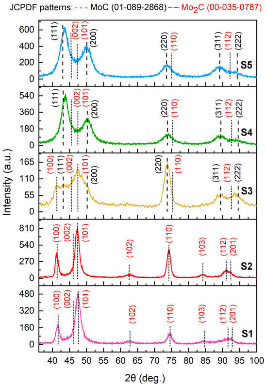 Figure 1 shows XRD patterns of five series of Mo-W-C films. It can be clearly seen that an increase in the power applied to the C target resulted in a change in phase composition. Samples could be divided into two groups. S1 and S2 carbides deposited at 15 W and 40 W consisted only of a hexagonal close-packed (hcp) β-Mo2C phase. However, applying a higher power (63 W, 84 W, and 110 W) drastically altered the structure of the Mo-W-C films.