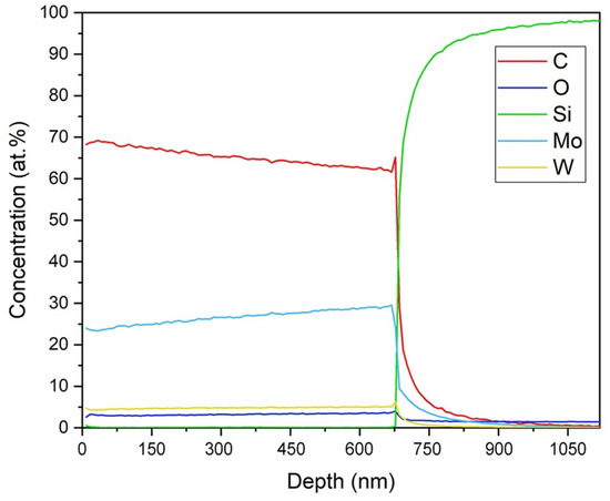Figure 3 shows the SIMS depth profile of the deposited Mo-W-C film of the S4 series. The distribution of 12C+, 16O+, 94Mo+, and 182W+ ion currents within the film was homogeneous. The stable deposition of the material created a uniform layer on the silicon substrate. There are no significant changes in the concentrations of individual components throughout the film thickness up to 670 nm. The analysis of oxygen distribution in the Mo-W-C film was complex since O2+ ions were used for the primary ion beam. Therefore, the oxygen signal during the Mo-W-C film sputtering was caused by the O2+ ions used for the element depth profiling. Moreover, the part of the oxygen plot concerning the Si substrate (above 670 nm) was burdened with a large error and did not describe the oxygen concentration.