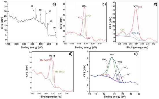 XPS survey spectrum (a) of Mo-W-C films (S4 sample) and high-resolution XPS spectra of O1s (b), C1s (c), Mo3d (d) and W 4f (e).