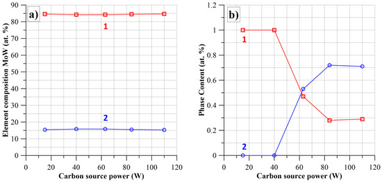 The results of the carbide composition calculations and excess carbon content for these samples are given in Table 4. Figure 5a shows the dependence of Mo and W elemental content on the carbon atoms’ source power (Table 4). It shows that, on average, there is one tungsten atom for about 5.5 molybdenum atoms. The constancy of the metal element content is because the power of the source of metal atoms is practically constant (Table 1).