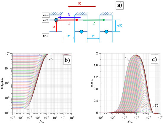 Tunnelling between potential wells in nanocomposites (a): A—thermal excitation of an electron, 1—tunnelling from the left well to the middle well, 2—tunnelling from the middle well to the right well, 3—return tunnelling from the middle well to the left well, ∆E—activation energy of tunnelling, r—distance between wells of potential. Dependence of σ(f)/σ0 (b) and α(f) (c) on the argument (f·τm) for 75 probability values p from 10−4 (1) do 0.5 (75).