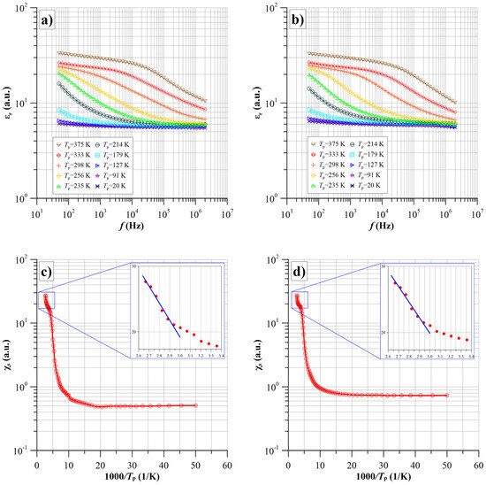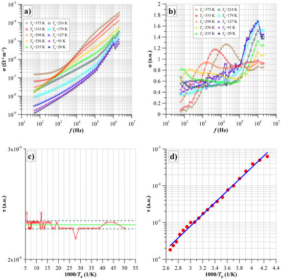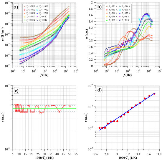 Figure 6a shows the frequency dependencies of the conductivity of the S1 layer for selected measurement temperatures in the range of 20–375 K.