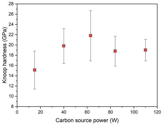 The Knoop hardness was determined using a Micromet 2103 (Blueher Ltd., Lake Bluff, IL, USA) microhardness tester at a load of 100 mN. Such condition of indentation was chosen to avoid an influence of the substrate material (the depths of the indents were no more than 9–10% of film thicknesses). Ten measurements were performed for each sample.