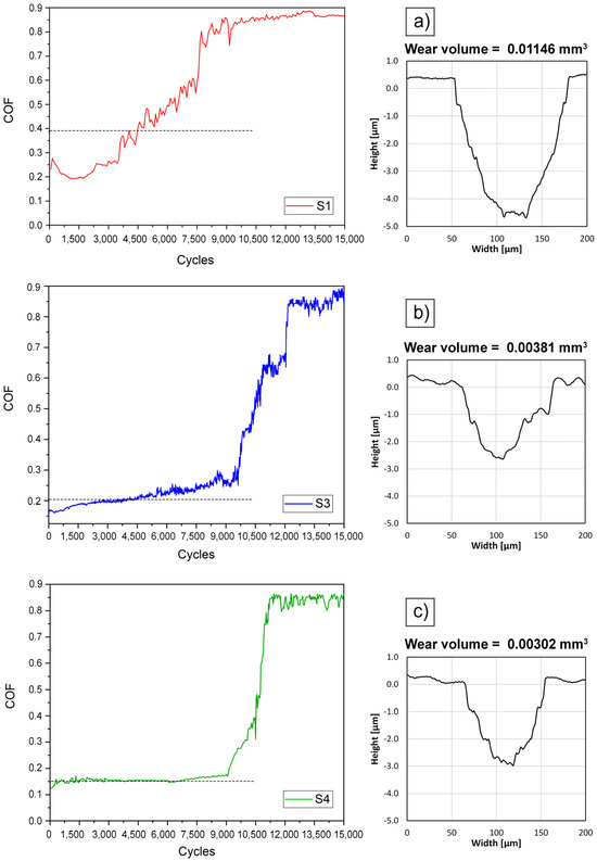 Evolution of the coefficient of friction depending on the number of cycles and 2D profiles of the wear tracks of S1 (a), S3 (b), and S4 (c) samples of Mo-W-C films after ball-on-disk at the load of 0.75 N. Horizontal dotted lines indicate the average values of the friction coefficients.