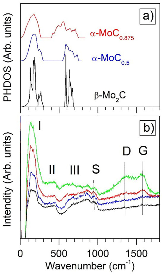 Calculated phonon density of states (PHDOS) of bulk α-MoCk [26] and β-Mo2C (a), and Raman spectra of the deposited S1 (black line), S2 (blue line), S3 (red line), and S4 (green line) coatings (b). Band and peak locations in the Raman spectra: 0–300 cm−1 (I), 300–500 cm−1 (II), 500–920 cm−1 (III), 960 cm−1 (S), 1356 cm−1 (D) and 1577 cm−1 (G). Adapted with permission from Ref. [26]. 2022, Elsevier.