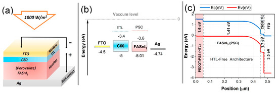 35]. This innovative approach aims to reduce fabrication costs and minimize interface defects without compromising cell performance. In addition to having good carrier transport, the perovskite solar cell also has a small Schottky barrier for carrier collection. Furthermore, this solar cell is made using a low-cost solution process at low temperatures. Given the substantial progress in perovskite solar cells, our research efforts have recently turned towards developing HTL-free FASnI