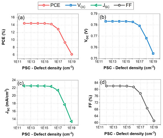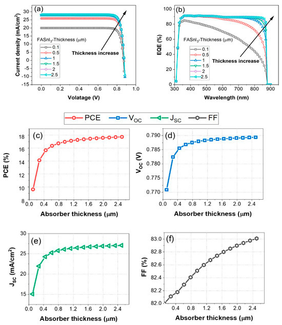 Figure 5c, the PCE increases due to thicker absorbers that generate and collect charge carriers more efficiently. Thicker absorbers generate more charge carriers due to enhanced light absorption. The short-circuit current density (JSC) can be expressed by Equation (6) as follows: