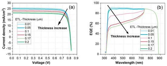 Figure 5b demonstrates the effect of the ETL thickness on the EQE across different wavelengths. As the ETL thickness increases, the EQE decreases significantly, especially in the longer wavelength range. For example, at 700 nm, the EQE drops from around 90% for an ETL thickness of 0.01 µm to about 40% for an ETL thickness of 0.2 µm. This reduction is due to the increased recombination losses and reduced light absorption efficiency in thicker ETLs, which limit the generation and collection of photogenerated carriers.