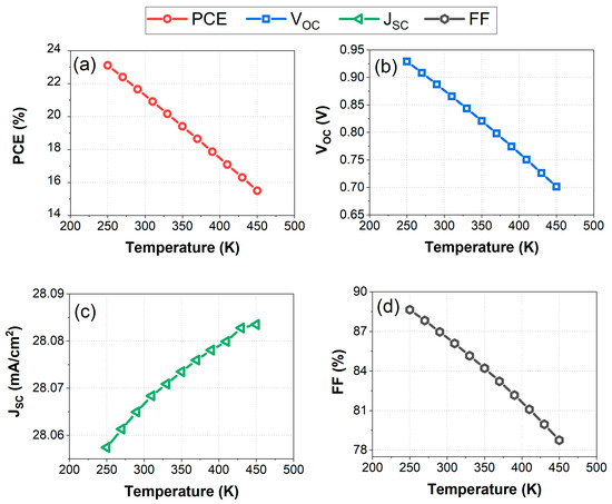 Figure 8a–d, increasing the temperature from 250 K to 450 K results in notable declines in key performance parameters. The power conversion efficiency (PCE) drops from approximately 21.95% at 250 K to about 14% at 450 K, reflecting the overall degradation in device performance due to higher temperatures. The open-circuit voltage (VOC) decreases linearly from around 0.90 V at 250 K to approximately 0.70 V at 450 K, indicating increased recombination rates and reduced effective carrier lifetimes at elevated temperatures. The reduction in the VOC with increasing temperature is due to the increased intrinsic carrier concentration, which enhances recombination. The relationship between the VOC and temperature is given by Equation (7) as follows: