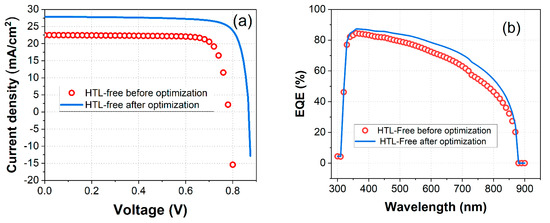 Figure 10a) before and after optimization. Before optimization, the J-V curve (red circles) showed a lower current density and a pronounced decline at higher voltages. After optimization, the J-V curve (blue line) exhibits a significant improvement in current density, maintaining a high value across the voltage range, particularly at higher voltages.