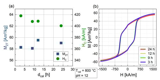 Particles with different dcal were analyzed with VSM to determine their magnetic properties (M2T and HC) at room temperature and with a maximum field of 2 T. Looking at the influence of dcal on the magnetic properties (Figure 2), no considerable dependence is found. HC slightly decreases from 418 kA/m to 400 kA/m while M2T is almost constant, ranging from 58.1 to 59.5 Am2/kg. As mentioned above, dcal was also evaluated for Tcal = 1200 °C and for other pH values (8, 10 and 13), where again no change in magnetization was found and only minor variations in coercivity occurred. This again indicates that after 3 h of calcination, no significant changes within the crystal structure are taking place. For this reason, 3 h was chosen as the calcination time for the following experiments.