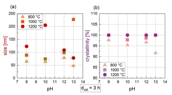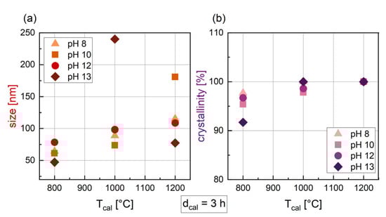 After changing the calcination temperature from 800 to 1200 °C, a small increase in crystal size can be seen for synthesis with pH 8 to 12 (Figure 3a), while for pH 13 a maximum size at Tcal = 1000 °C was found. In general, the size of particles synthesized with varying Tcal and with dcal = 3 h ranges from 47.3 nm to 240.1 nm. An increase in crystal size with rising temperature can be confirmed by the literature, with several authors reporting the same trend. Yenaso et al. [39] found an increase in size from 60 nm to 77 nm when increasing the temperature from 800 °C to 1000 °C with a pH of 14. Hu et al. [40] reported an even more pronounced increase in size from 63 nm at 800 °C to 153 nm at 1100 °C (pH = 9 and dcal = 2 h). For crystallinity (Figure 3b), a slightly increasing trend can be assumed, with higher Tcal leading to higher crystallinities. For Tcal = 1200 °C, all the samples are 100% crystalline.