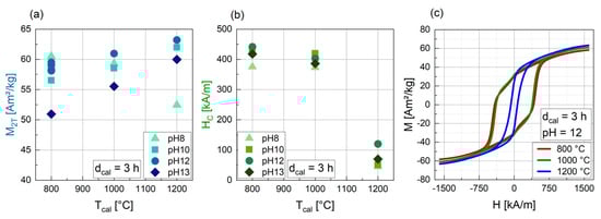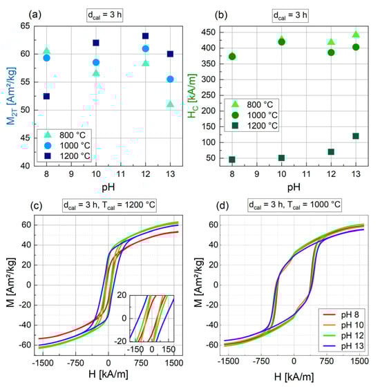 Depending on the calcination temperature used after the precipitation step, different trends can be seen in the magnetic characterization for different pH values (Figure 7). For Tcal = 800 °C and 1000 °C, M2T is rather constant for pH 8 to 12 and drops slightly for pH 13 (Figure 7a). HC for the same Tcal is high, with values of 373 kA/m to 441 kA/m (Figure 7b). For Tcal = 1200 °C, in contrast, a pH of 8 leads to a low M2T of 52 Am2/kg, while a higher pH from 10 to 13 enables high M2T with values ranging from 60 to 63 Am2/kg (Figure 7a). The related HC for Tcal = 1200 °C is much lower compared to Tcal = 800 or 1000 °C, with values from 45 kA/m to 120 kA/m and a slightly increasing trend with increasing pH. The relation between pH and HC is clearly evident in the hysteresis curves. For Tcal = 1200 °C (Figure 7c), the hysteresis curves are rather narrow with a bigger HC for a higher pH, while for Tcal = 1000 °C (Figure 7d), the hysteresis curves are very broad and HC is nearly constant.