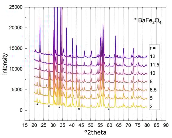 Pure M-type hexaferrite was synthesized with r = 11.5, slightly below the stochiometric ratio in BaFe12O19. For r = 12, only a very small amount of 0.5 wt% of Fe12Na4O20 was detected in addition to the hexaferrite. In the literature, one can find several reports that indicate an iron-deficient ratio is beneficial for the synthesis of the pure M-type hexaferrite phase [29,32,33]. Apart from BaFe12O19, the barium monoferrite BaFe2O4 was found in samples with a low r between 2 to 8. Compared to the hexaferrite, this barium-rich phase tends to form when a barium excess is present in the initial solution. As mentioned before, BaFe2O4 is assumed to be an intermediary in the formation of barium hexaferrite. In the sample with r = 5, small amounts of iron oxide Fe21.4O32 were detected and two different barium iron oxides were detected for sample r = 10. The XRD diffractograms of all the samples with varied r are seen in Figure 9. The diffractograms mainly show the characteristic peaks for BaFe12O19, with some peaks assigned to the BaFe2O4 phase (indicated by stars in Figure 9), which decrease in intensity with an increase in the Fe/Ba ratio.