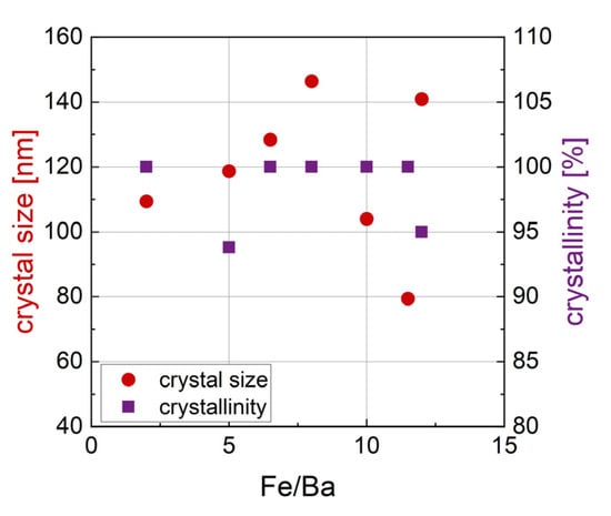 The relation of crystal size and crystallinity with r can be seen in Figure 12. The size and crystallinity do not show clear trends with an increasing Fe/Ba ratio. The size ranges from 79.4 nm to 146.4 nm and appears to be random in relation to the Fe/Ba ratio. Note that the size was calculated by a Williamson–Hall plot of the peaks assigned to the BaFe12O19 phase; therefore, it only characterizes the size of crystals of this phase. The crystallinity of the sample is high in general, with only two samples, r = 5 and r = 12, exhibiting a crystallinity below 100%, of 93.8% and 95%, respectively.