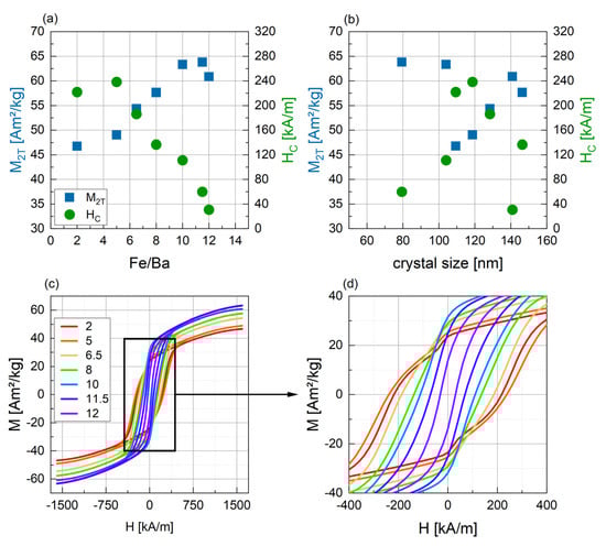Looking at Figure 13b, no clear relation of HC and M2T with the crystal size can be seen. For HC, it might be assumed that intermediate crystal sizes lead to the highest HC values, while HC is lower for smaller and for larger crystal sizes. This might indicate a transition from a single-domain state to a multi-domain state. To confirm this relation, further investigations and more data points are required. As discussed above, a decrease in HC with an increase in crystal size is usually explained by the formation of multi-domain structures. In the SEM images in Figure 11, a fraction of very small particles is seen for samples with a lower r, while the particles in samples with r > 10 appear bigger. This tendency towards the formation of entirely multi-domain particles can explain the decrease in coercivity with a rising Fe/Ba ratio. In summary, by increasing the amount of Ba2+ in the synthesis, coercivity can be increased, but a compromise between high M2T and HC needs to be found.