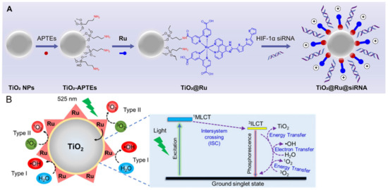 (A) Construction of the nanocomposite TiO2@Ru@siRNA. (B) Mechanism of TiO2@Ru nanoparticles producing ROS through Type I and Type II pathways [42].