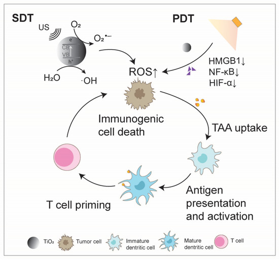 Titanium oxide boosts the anti-tumor immunity cycle. During the initiation and activation phase of the tumor immunity cycle, TiO2 can serve as a sonosensitizer and photosensitizer, inducing oxidative stress in tumor cells to generate reactive oxygen species (ROS). This process promotes the immunogenic cell death of tumor cells, leading to the release of tumor-associated antigens (TAAs) that enhance antigen presentation and activate dendritic cells (DCs). Ultimately, the activation of DCs promotes T cell function, enabling the recognition and elimination of tumor cells.