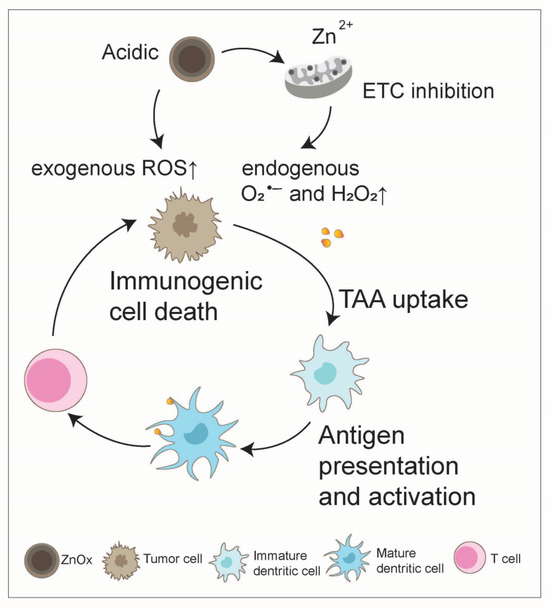 Zinc oxide boosts the anti-tumor immunity cycle. Zinc oxide nanoparticles have the ability to increase oxidative damage to cancer cells by generating both endogenous and exogenous reactive oxygen species (ROS). In an acidic tumor microenvironment (TME), zinc oxide releases zinc ions, which disrupt the electron transfer chain, leading to an upsurge in endogenous ROS production within the mitochondria. This, combined with the externally generated ROS, synergistically contributes to the anticancer effects of zinc oxide nanoparticles and consequently facilitates tumor immunogenic cell death and enhances the anti-tumor immunity cycle.