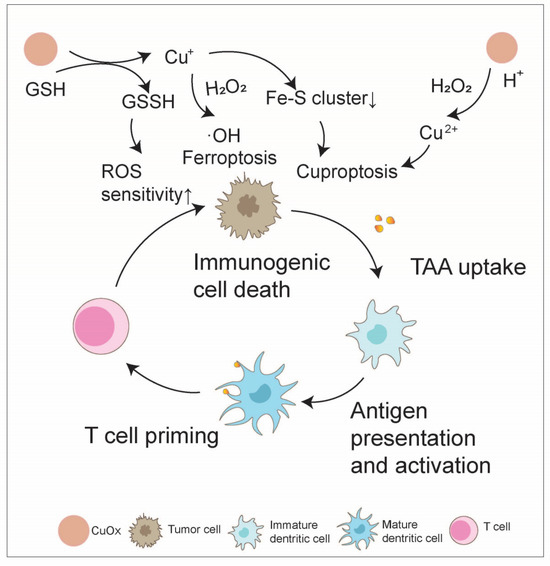 Copper oxide boosts the anti-tumor immunity cycle. Copper oxide nanoparticles can interact with glutathione (GSH) and H2O2 in the tumor microenvironment (TME), leading to increased reactive oxygen species (ROS) production and sensitization to ROS via ferroptosis and cuproptosis pathways, and ultimately facilitates the immunogenic cell death of tumor cells, initiating the anti-tumor immunity cycle.