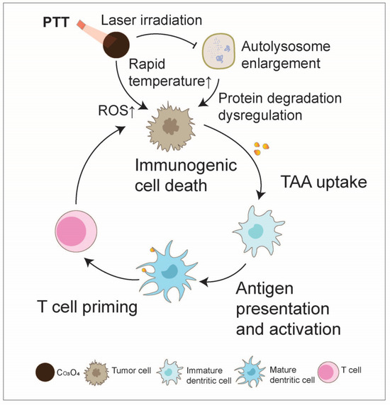 Cobalt oxide boosts the anti-tumor immunity cycle. Co3O4 nanoparticles can induce autolysosome accumulation and functional impairment by inhibiting the proteolytic activity of lysosomes, thereby inhibiting cancer progression. Additionally, they can serve as a photothermal agent to enhance reactive oxygen species (ROS) production and induce the death of tumor immunogenic cells, thereby facilitating the anti-tumor immunity cycle.