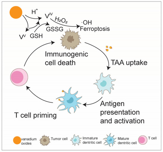 Vanadium oxide boosts the anti-tumor immunity cycle. The transition metal vanadium, with its multivalent states, exhibits high Fenton-like catalytic activity. The mixed valency of vanadium (VIV and VV) plays a key role in triggering ferroptosis by cyclically altering the valency of V, leading to the generation of hydroxyl radicals (·OH) for the accumulation of lipid peroxidation, ultimately initiating immunogenic cell death in tumor cells.