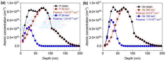 Around 100 nm thick ZnO films were deposited via atomic layer deposition (ALD) on Si wafers with a 100 nm thick SiO2 layer via Savannah 300C, either at 130 °C or 200 °C with a growth rate of 1.8 Å/cycle and 1.4 Å/cycle, respectively. Diethylzinc (DEZn) from Sigma-Aldrich (product no. 256781) was employed as a zinc precursor, and deionized water (H2O) was used as an oxidant for the ZnO layers. A continuous N2 flow of 0.3 Torr was applied as a carrier gas to introduce the precursors into the reaction chamber and employed as a purging gas to remove unwanted byproducts from the chamber at the same time. Both ZnO films were deposited with 25 ms pulsing time, while the purging time was 8 s and 16 s for DEZn and water, respectively. The deposited ZnO films are polycrystalline. More details about growing conditions can be found in the reference []. Next, ion implantation was applied to introduce phosphorus (P) or antimony (Sb) into the ZnO layer. The films were doped with two different dopant concentrations by a low and a high implantation dose. Specific implantation parameters are listed in Table 1. In order to ensure a homogeneous doping profile, two implantation energies were combined. Both energies were calculated individually for P and Sb using the SRIM code []. The calculated depth distributions for P and Sb after ion implantation with two energies are presented in Figure 1a,b, respectively. For phosphorus-doped ZnO (PZO) samples with a low dose, the first implantation was made at an energy of 90 keV with an implantation fluence of 7.5 × 1015 cm−2. The subsequent implantation was made at an ion energy of 30 keV and a fluence of 1.5 × 1015 cm−2. Due to the larger atomic mass of antimony compared to phosphorus, higher energy is necessary to ensure the same dopant distribution in ZnO. Sb+ ions were implanted into the ZnO film (SZO) first with an energy of 300 keV and an implantation fluence of 6 × 1015 cm−2 and next with an energy of 100 keV and a fluence of 1.7 × 1015 cm−2. In the case of high-dose samples, ion fluences for each implantation step were doubled. Within the content of this paper, samples implanted with lower and higher doses are indicated as LD and HD, respectively. The simulated depth distributions of implanted elements are shown in Figure 1. After ALD and ion implantation, the wafers were cut into 1.2 × 1.2 cm2 pieces and post-processed separately by RTA and FLA using different atmospheres. In the case of RTA, the samples were annealed at 800 °C for 60 s, while the pulse length of FLA was 23 ms. Both annealing methods were conducted in a continuous flow of N2 or O2.