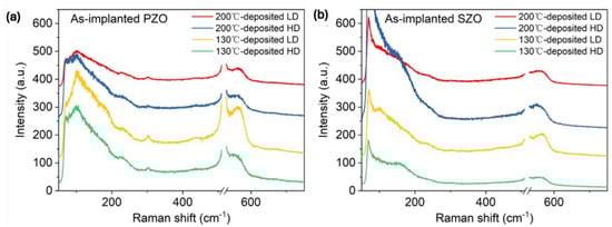 In our case, all as-implanted samples show a broad peak at about 580 cm−1, possibly due to the broken symmetry, e.g., due to ion-induced defects, that can be assigned to the A1(LO) mode superimposed with the E1 phonon mode [,]. In wurtzite crystal ZnO, the optical phonons, denoted as Γopt, are expressed as the sum of vibrational modes: Γopt = 1A1 + 2B1 + 1E1 + 2E2. Wherein, A1 and E1 modes exhibit polarity and further divide into a transverse optical mode (TO) and a longitudinal optical mode (LO) (A1(TO), A1(LO), E1(TO), E1(LO)) and they are all Raman active, while B1 modes behave as a silence mode. E2 modes are also Raman active, but they are nonpolar. After annealing, the implanted layers are crystalline and the ZnO is transparent for the green light used here. Therefore, the intensity of the Raman peaks after annealing is weaker. Nevertheless, Raman spectroscopy provides basic information about the recrystallization process of the implanted and annealed layer and the possible formation of clusters from the implanted elements.