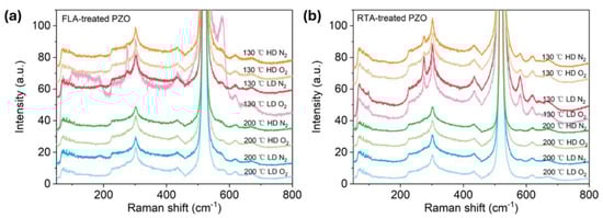 As shown in Figure 4a,b, after FLA or RTA, the implanted PZO recrystallizes. The broad peaks caused by disordered grains shown in as-implanted samples disappear, and the peak located between 570 cm−1 and 585 cm−1 occurs in the Raman spectra, which could be assigned to the A1(LO) out-of-plane vibration phonon mode or the E1(LO) phonon mode due to the in-plane vibration within the wurtzite ZnO lattice []. In the case of FLA performed in N2 atmosphere, the samples show the phonon mode located close to 572 cm−1, while after annealing in O2, the main phonon mode is closer to 582 cm−1. In the case of RTA-treated PZO, the new peaks are located at 582 cm−1. Since the A1 phonon mode is usually observed at a lower frequency than E1 (shifted to a lower wavenumber by about 10 cm−1), and in samples with defects causing the symmetry breaking, this suggests that FLA in nitrogen promotes the formation of oxygen vacancies while annealing in oxygen more efficiently neutralizes the point defects like oxygen vacancies and Zn interstitials. Moreover, P-doped ZnO grown at 130 °C exhibits an additional phonon mode at about 275 cm−1, which was not found within samples grown at 200 °C. The active Raman phonon mode at 275 cm−1 was found and reported first in nitrogen (N)-doped ZnO, and the peak intensity had a linear relationship with N concentration. It was interpreted as a N-related mode []. Massazza et al. [] identified this peak with the vibration of an interstitial Zn atom bound to a substitutional nitrogen atom (Zni-NO). However, this conclusion was ruled out soon because these vibrational modes were also found in ZnO doped with other elements, such as Al, Sb, Fe, and Ga []. As these elements come from different groups and periods and have different atomic structures, the phonon mode located at about 275 cm−1 is considered to be caused by intrinsic defects in the host lattice, which either become activated as vibrating complexes or their concentration increases upon dopant incorporation []. Later, this peak was found also in undoped pulse-laser-deposited ZnO without O2 plasma treatment and ascribed to vibrations within Zn clusters []. Until now, there has been no consensus on the origin of this peak in the literature. In our work, this phonon mode is present in samples grown at 130 °C, which suggests that it can be due to some residual defects.
