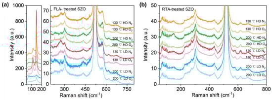 Raman spectra of Sb-implanted samples grown at different temperatures and annealed either in a N2 or in a O2 atmosphere using FLA treatment (a) or RTA (b). The low-frequency part of the Raman spectra from (a) is shown separately at a different scale due to very intense peaks.