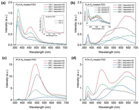 Room temperature PL spectra of (a) FLA-N2-treated, (b) FLA-O2-treated, (c) RTA-N2-treated, and (d) RTA-O2-treated PZO grown at 130 °C and 200 °C, and then implanted with different dopant doses, respectively. The insets in (a,b) show the PL spectra obtained from as-grown and as-implanted ZnO, respectively.